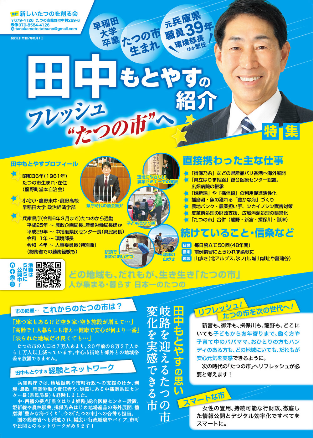 中播磨県民センター長や環境部長などを経て、たつの市の未来に向けた政策実現に取り組んでいます。