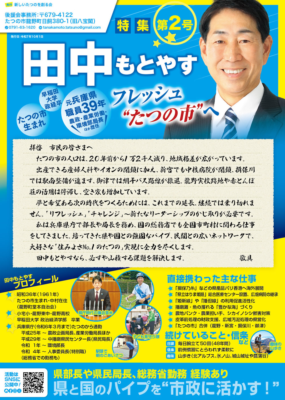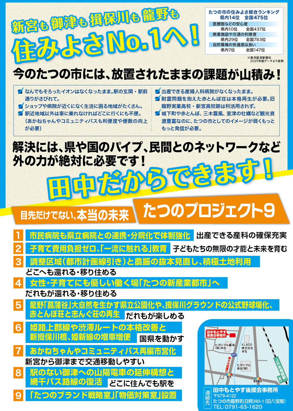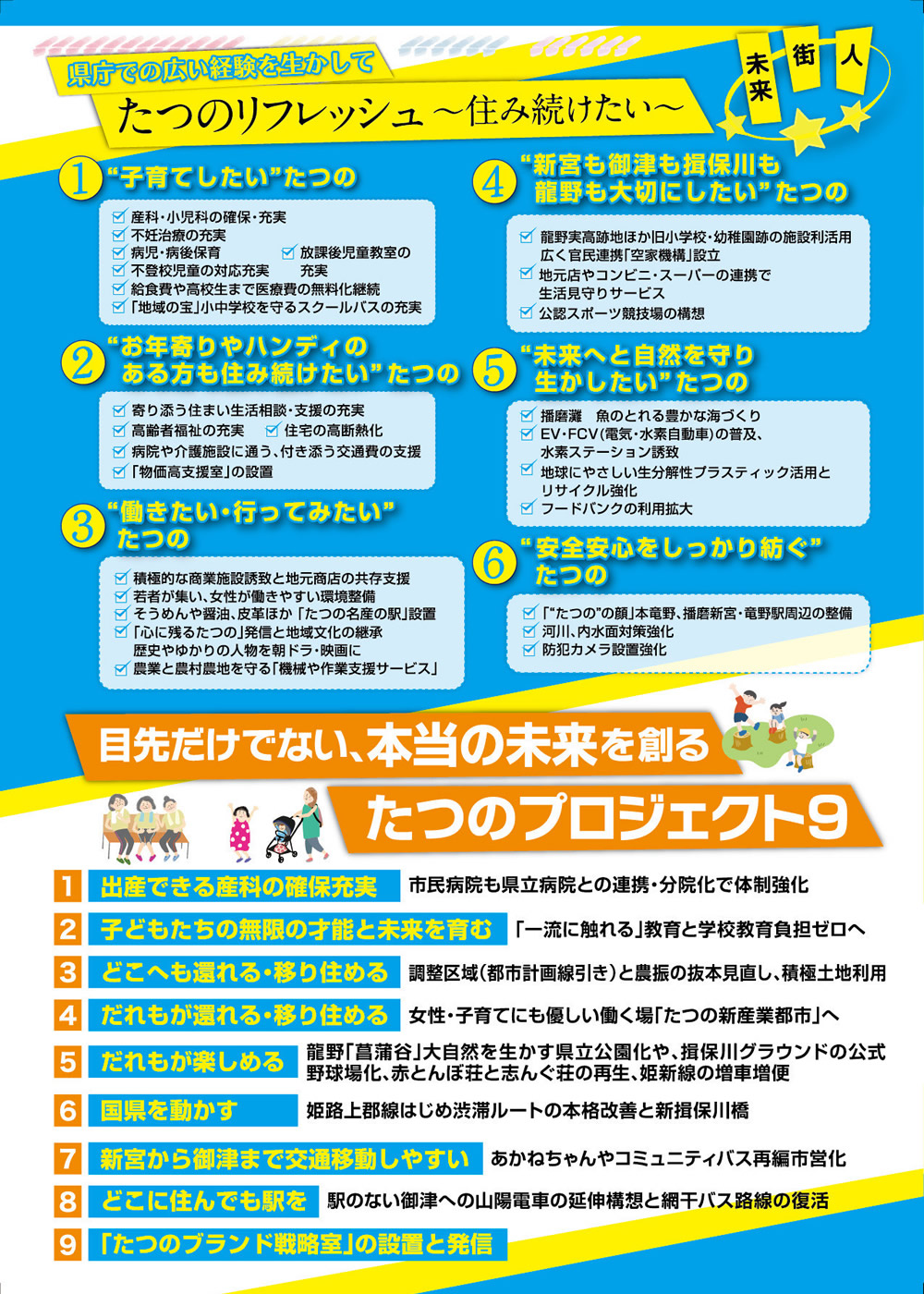 皆さまのお声をしっかりとたつの市政に反映し、実現するように、私は力の限り取り組むことをお約束します。