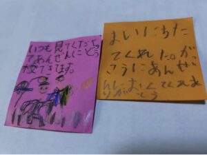 地元の堂本の朝の子ども見守りの際に、登校する子どもたちから、お礼の手書きカードをもらいました。